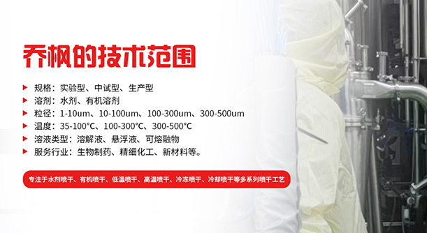 上海喬楓實業有限公司,成立于2012年,是從事噴霧干燥設備的研發設計、生產、銷售(小型噴霧干燥機,實驗型噴霧干燥機35℃低溫噴霧干燥機,有機溶劑噴霧干燥機,低溫閉式循環噴霧干燥機、超細粉末噴霧干燥機噴霧冷凍干燥機、真空噴霧干燥機、氣流噴霧干燥機噴霧造粒干燥機,離心噴霧干燥機,沸騰制粒機等)和售后于一體的綜合性公司,本公司現成為一家致力于為生物制藥、精細化工、新能源、陶瓷造粒及食品工程等領域提供全套解決方案的整線交鑰匙工程企業。